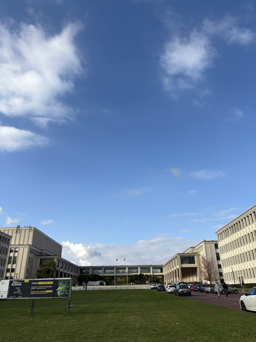 語学学校はカーン大学キャンパス1の中にあります。キャンパスはとても広く、芝生が多いのが特徴です。天気の良い昼間には、学生たちが木陰で勉強したり昼寝をしている姿もよく見かけます。その芝生に大きなスクリーンを設置して「ナイトシネマ」が開催されることもあり、学生たちはお菓子や食事を持ち寄って映画を楽しんでいます。エンディングでは皆が前に集まり、歌ったり踊ったりと大変盛り上がりました。