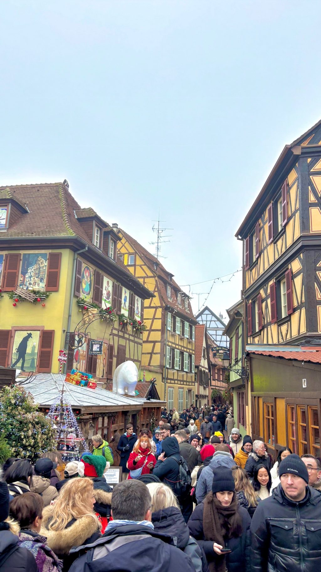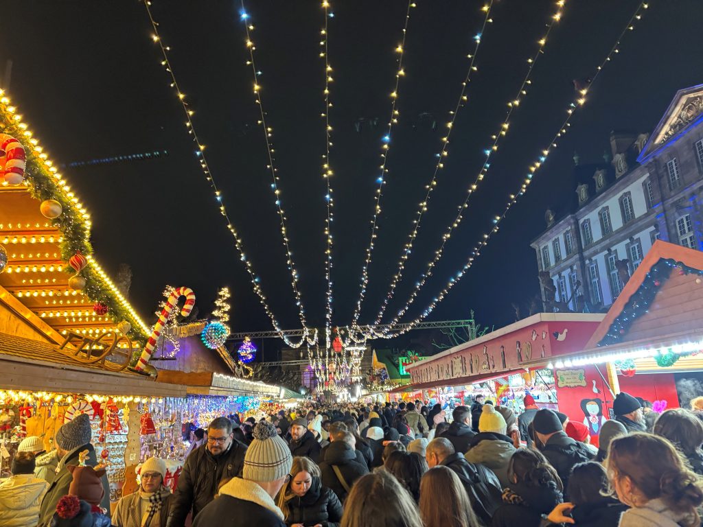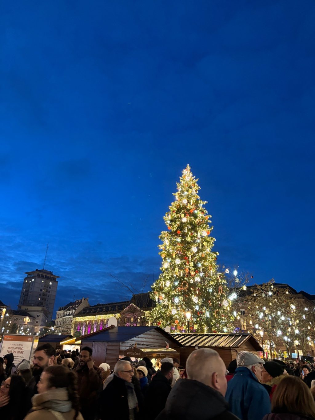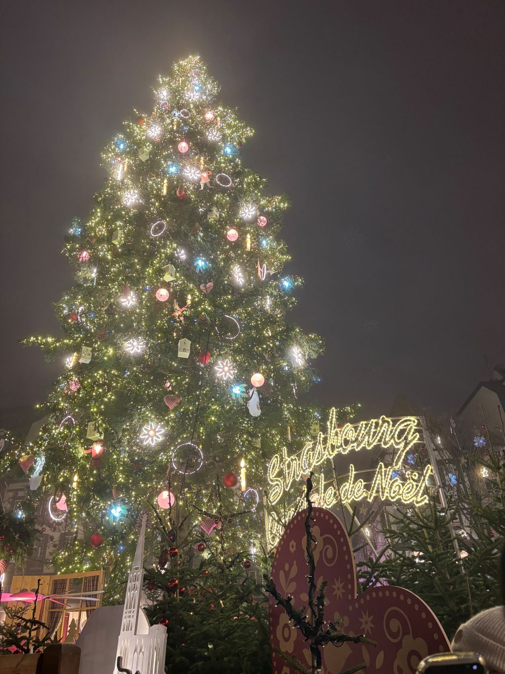 そしてもちろん勉強だけではなく旅行や遊びにも出かけています。ストラスブールはフランスの端にあるということもあって比較的他の都市よりもフランス国外に出やすいです。特にドイツはフランスよりも物価が低く、トラムでも自転車でも行けるため休日は買い物によく出かけています。ほかにもヨーロッパの東の方に出やすく、バカンスや休日を利用して今のところミュンヘンやニュルンベルク方面のドイツ、ポーランド、スイス、オーストリアに行きました。フランス国内ではフランスに留学中の日本の大学の友達とパリの年越しを見に行くなど、日本からでは費用などの関係で体験することが難しいことをたくさんやりたいなと考えています。そしてストラスブールといえばクリスマスマーケットですが、すごかったです。今年は11月26日から12月24日までの約一か月間ありましたが店の数も本当に多く、たくさん行きましたが行っても行っても「ここ来たっけ⁉」になるくらい広いので面白いし、毎回新鮮でした。食べ物系のお店はVin chaudやクレープ、プレッツェル、雑貨系ではスノードーム、クリスマスツリーに掛けるもの、キャンドル系のものが多かった印象です。もちろん他にもジンジャークッキーやゴーフル、ぬいぐるみ、石鹸、毛糸、おもちゃなどいろいろなレパートリーの出店がありました。街もいたる場所にイルミネーションがありどこを撮っても本当に綺麗でした。クレベール広場に大きなクリスマスツリーがあったのですが16時から1時間ごとに点灯ショーも行われ、とても賑わっていました。正直、クリスマスマーケットだけでも留学先をストラスブールに決めて本当に良かったなと思います。それくらいの迫力と盛り上がりがありました。日本のクリスマスマーケットは入場料が必要であったり、街全体がクリスマス一色になることはないのでここまで大規模なクリスマスを体験できて幸せです。