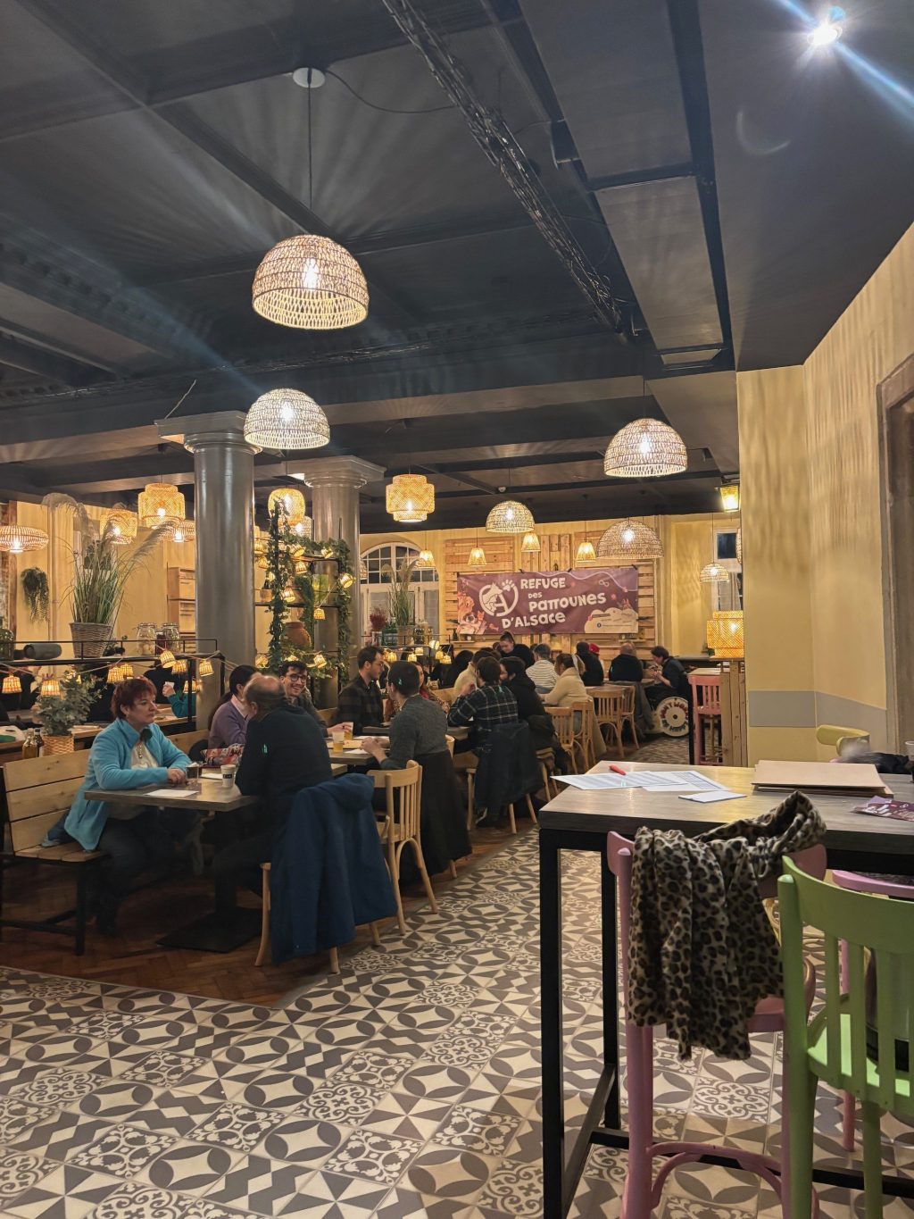 次に寮生活や勉強面以外の大学生活についてお話します。フランス人と関わることができる機会は多く、特に寮では寮生限定のクラブやイベントが多数あり、クラブは自転車クラブや料理クラブ、献血クラブ、女の子の会なんてものもあります(笑)。「ザ・部活」のような感じはなく、この前映画クラブに行きましたがゆるく楽しむ会という印象が強かったです。ほかにもクレープパーティーやBBQ、クリスマスパーティーなどがあり本当に様々です。寮の0階にあるレストランでは休日に一般の方がイベントを開いている時があり、この前匂いにつられて参加したものは犬を保護する団体によるタルトフランベ(アルザスの伝統料理)のイベントでした。またパーティー以外にも寮の友達が部屋に遊びに来たり、逆に行ったり、友達がお菓子を作ってキッチンに呼んでくれたり、寮のTVルームで誕生日パーティー開いていたりとフランス人と関わる機会は沢山です(笑)。また、私の寮では寮生とすれ違うと必ず挨拶するのですが他の学生寮に住んでいる子たちはそういうのはないと言っていたので比較的私の寮は寮生同士の距離が近いのかなと感じました。寮以外にもフランス人と関わる機会は多くあります。例えば、大学では日本語学科があるため定期的に日本人と日本語学科のフランス人学生が話す会が設けられていたり、それ以外にもフランス人と日本人が金曜日の夜に一緒に飲む集まりがあり、そこでは大学生以外のフランス人も多く参加しており、飲みに行く以外にもスケートに行ったり、クリスマスマーケットに行ったりもしています。それ以外にも私は参加していませんが日本語を学びたいフランス育ちの方々に日本語を教えるボランティアもあるようです。