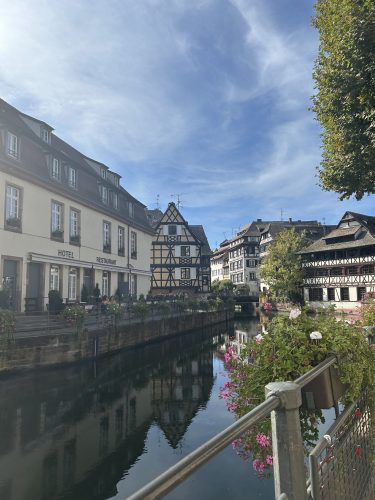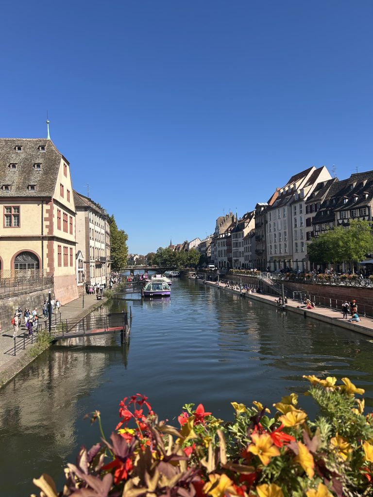 私が研修地に選んだストラスブールは、ドイツとの国境に位置するアルザス地方の町です。街の中心には大聖堂や「プティット・フランス」などの観光地が広がり、美しい自然の中に人々の暮らしが感じられる、とても素敵な場所でした。特に、晴れた日にイル川にかかる橋から見える景色がお気に入りで、気分が落ち込んだときもその景色を見ることで前向きな気持ちになれました。事前に「ストラスブールの人は温かい」という情報を目にしていましたが、実際に滞在してみて、多くの優しさに触れることができました。例えば、語学学校に初めて登校する日の電車の中でとても緊張していた私に、見知らぬ男性が「今日から語学学校?頑張ってね」と声をかけてくれたことで、少し気持ちが楽になりました。また、大聖堂に一人で登ったときには警備員の方が話しかけてくださり、大聖堂の歴史やストラスブールのおすすめスポットを教えてくださっただけでなく、フランス語の勉強も応援してくださり、とても嬉しい気持ちになりました。
